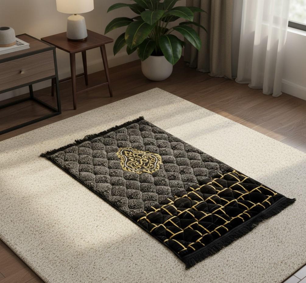 Experience unmatched comfort with our Premium Jumbo Black & Grey Velvet Prayer Mat, designed with a beautifully detailed golden centerpiece motif and a striking stone-style lower border.