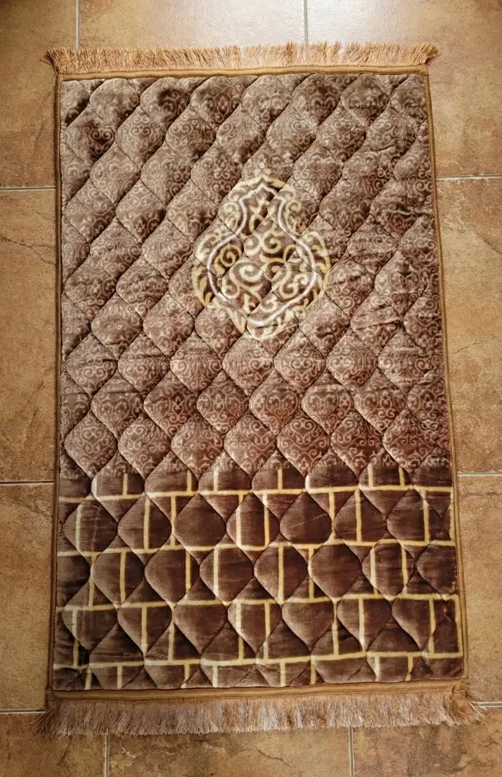 A soft brown velvet jumbo prayer mat featuring an elegant golden motif and quilted texture for extra comfort. Lightweight, durable, and perfect for daily use or gifting.